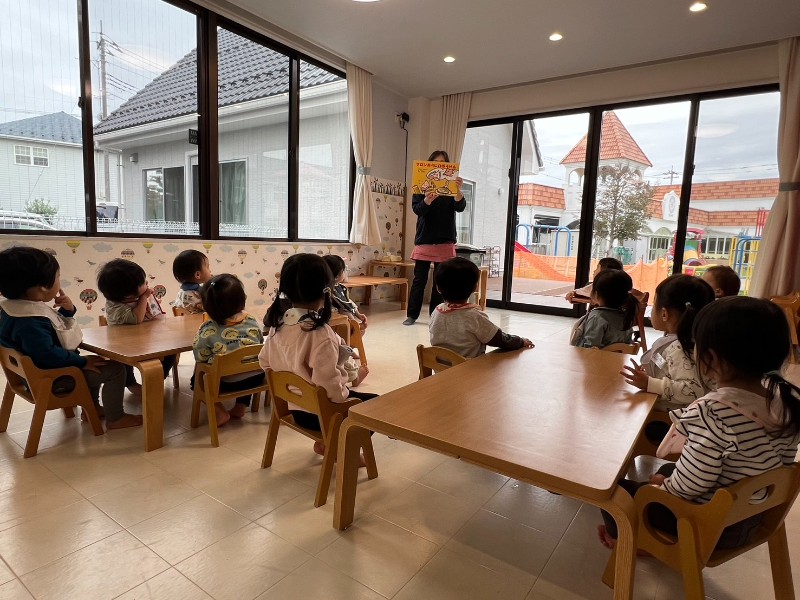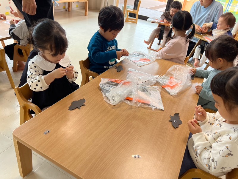 ★ハロウィン週間★ハロウィンパーティーで使うバック制作をしました♪コウモリに目のシールを貼ったりキャンディを選んだりどんなバックが完成するのかな❤給食の準備が出来たら紙芝居time!お話を聞く姿勢に子どもたちの成長を感じました!