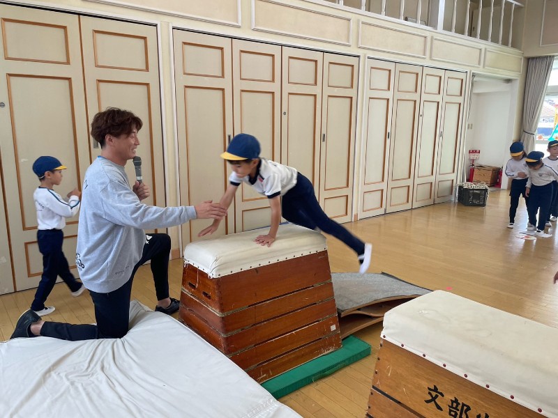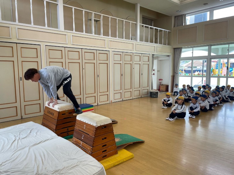 体操教室ではジャンボ先生に実際にやってもらいながらどこを気を付けるのか・上手な跳び方などポイントアドバイスをしてもらいました♪そのアドバイスを意識しながらチャレンジしてみましたよ!
