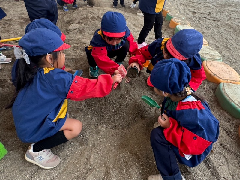 今日の一コマを紹介します♫人気スポットのお砂場はクラス関係なく自然と『お友達の輪』が広がっていきます!大きなお山を作る為に年少さんなりの役割分担も…お友達と声を掛け合いながら一生懸命作る姿に寒い一日でもホッコリした空気になりました♡《里美》