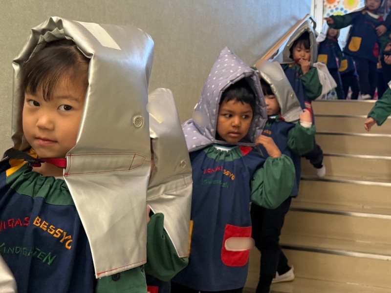 そして防災頭巾をしっかりと被り...