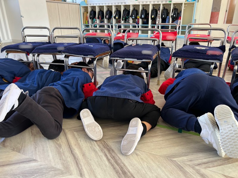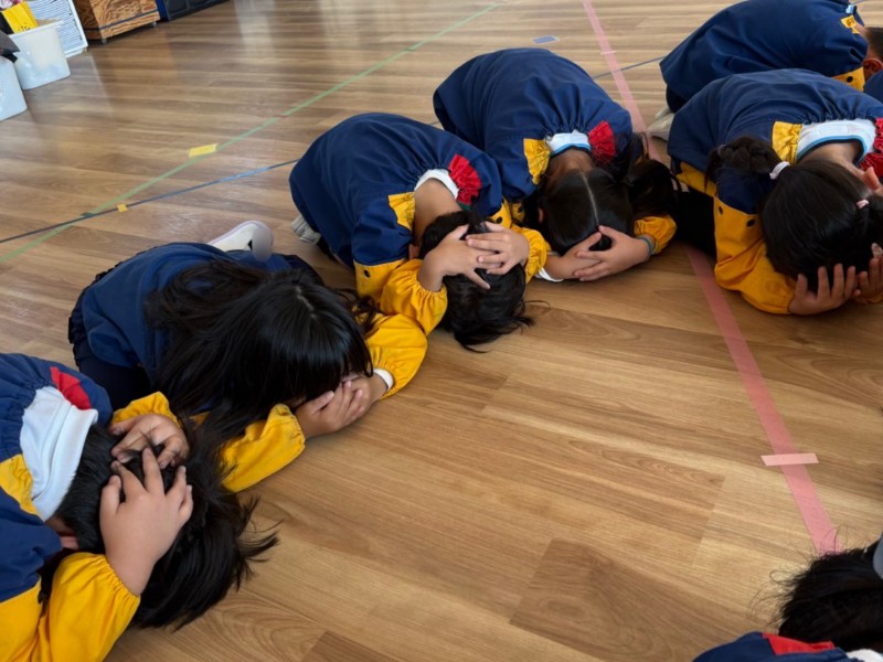 近頃、熊本県では地震が多発しています。これに伴い、地震を想定した避難訓練を行いました。放送を聞いたらすぐに頭を守る!