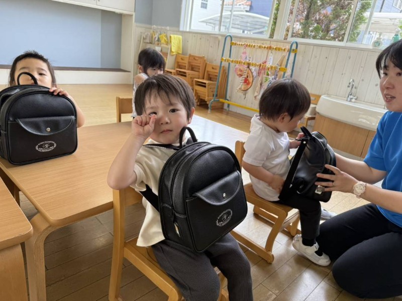 毎日元気なお返事をお願いします♪朝の支度の中に「おカバン、チェックTime」があります「たぬきのおなか」を合図にカバンを前にして抱えます