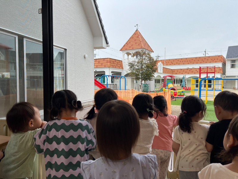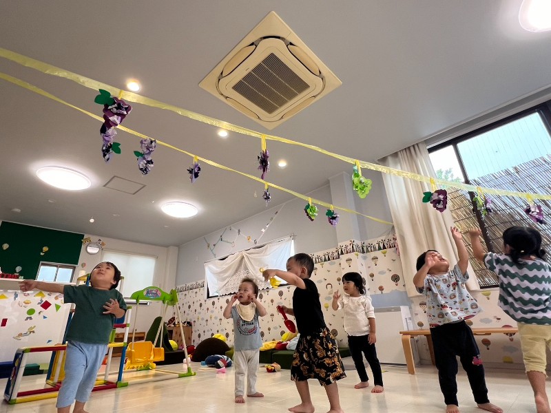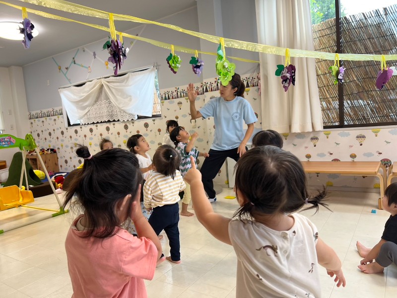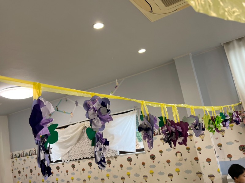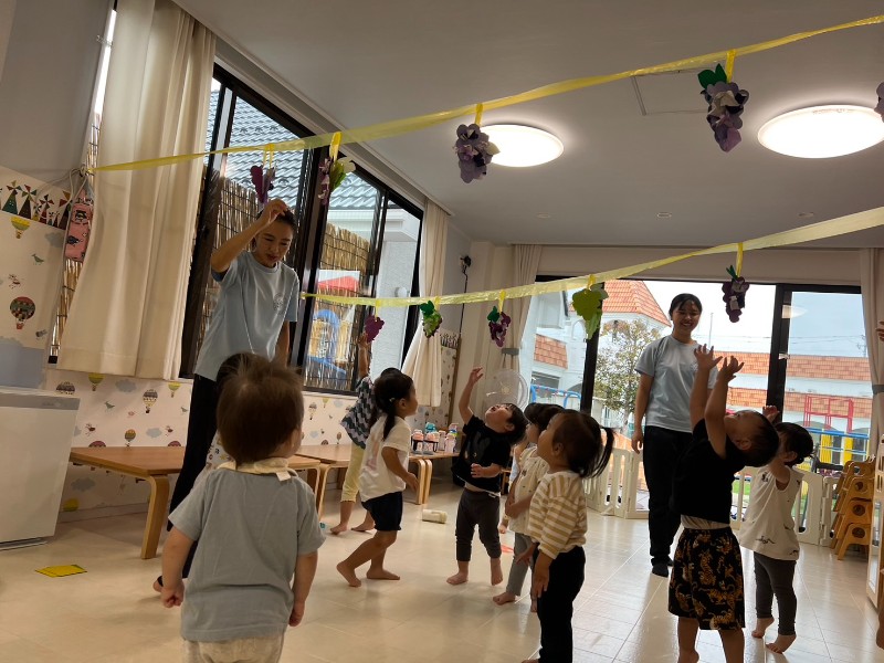 久しぶりの雨・・・☂「ポタポタしてる」「おそといけない?」子どもの背中から気持ちが伝わってきますね・・・以前作った制作物を使って教室がブドウ畑に変身!!みんなでブドウ狩りを楽しみました♪美味しいブドウはどれかな?「あった!!」雨の日でも楽しく過ごしました❤明日はお散歩に行けるかな・・・