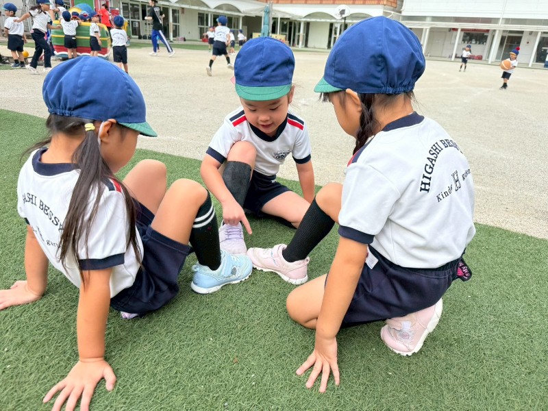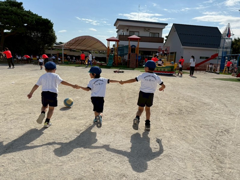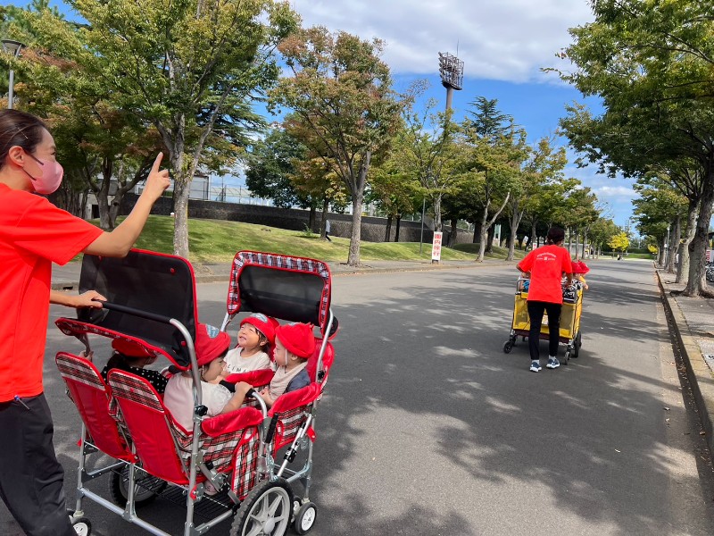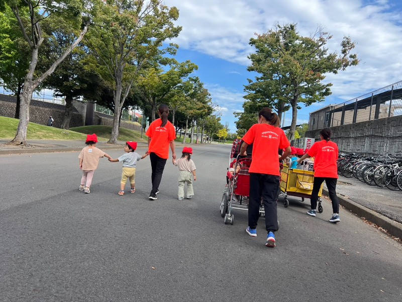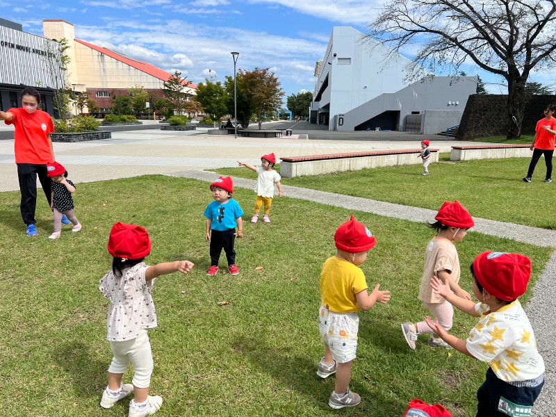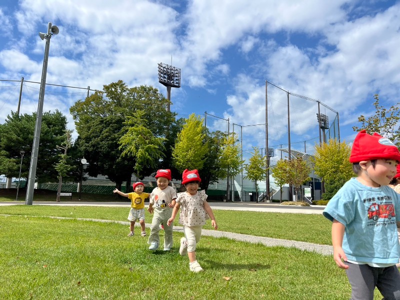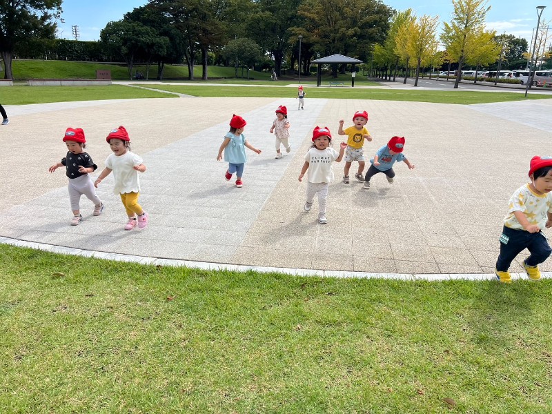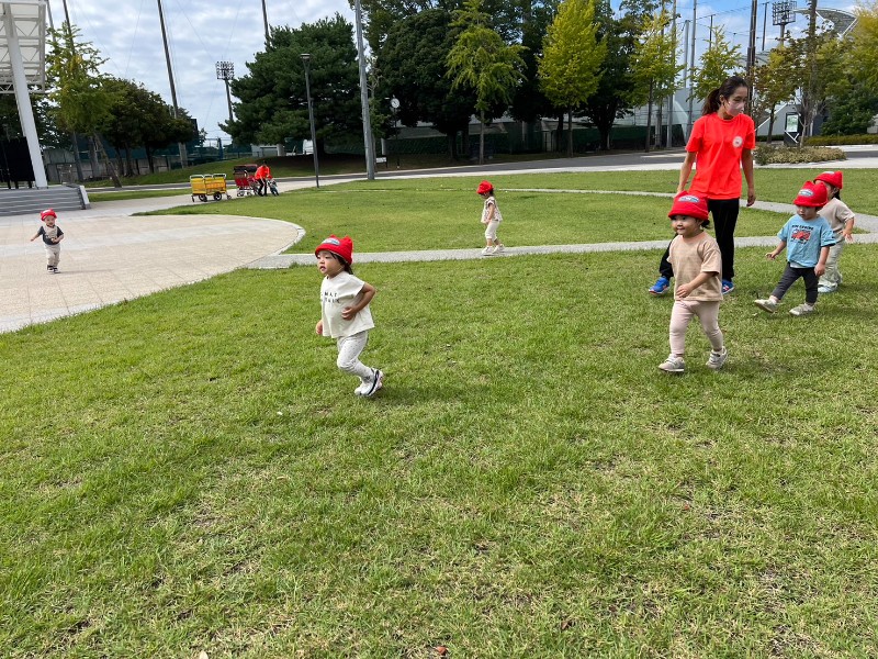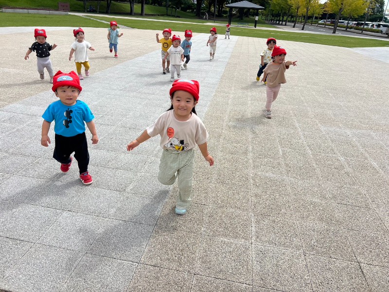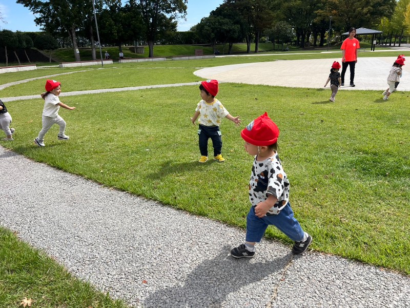 明日から10月!いよいよ秋本番ですね♪金木犀の香りは・・・まだまだのようですが気持ちの良い風が吹いていて今日も元気なキティ組は運動公園までお散歩に行ってきました!「葉っぱは何色かな」「赤い・・・黄色・・・あった!!」野外ステージ前では追いかけっこをしたりトンボを捕まえようとしたり楽しかったね♪今度は、どんぐり拾いをしようね❤