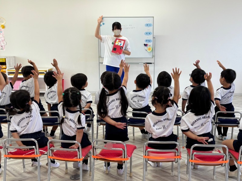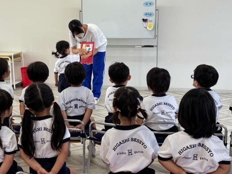 今日は幼稚園の先生になる為の実習生の登竜門!!今までの生きた保育で学んだ事を生かす責任実習でした。「何が始まるんだろう?」子どもたちは始まる前からドキドキ♫スケッチブックシアターを使ったお話に興味津々でした。ガチャガチャを回すと中から果物が出てくる楽しい仕掛けにみんな大喜び♪終わった後は「あー楽しかった!」そんな素敵な言葉で溢れました^_^責任授業を通して職員も保育を深め新たな発見や学びが見つけられる時間となっています。
