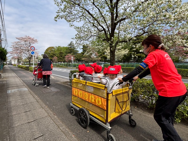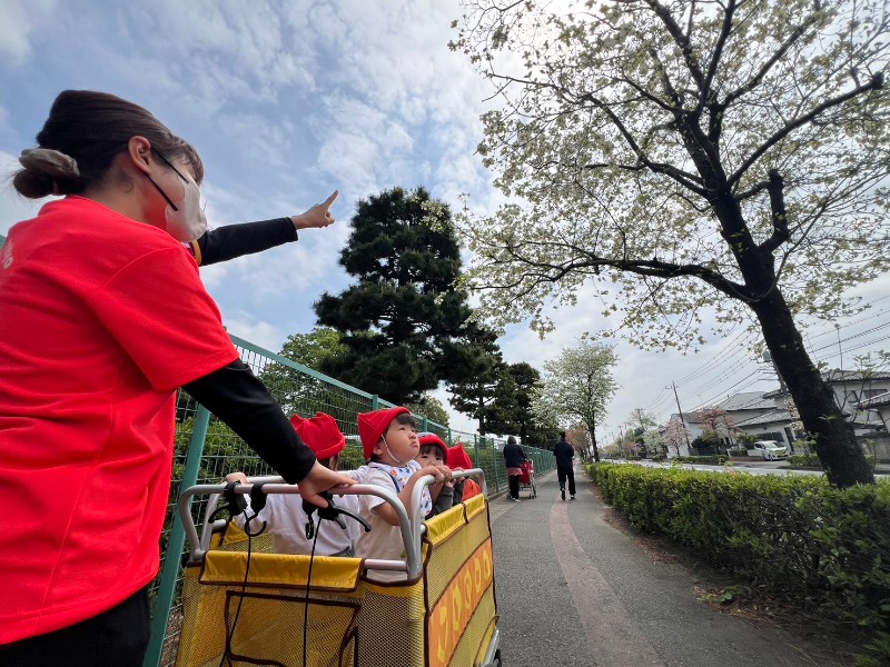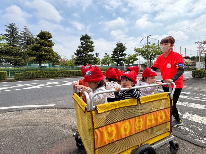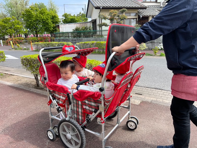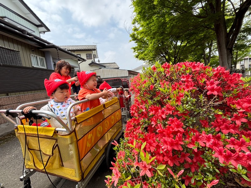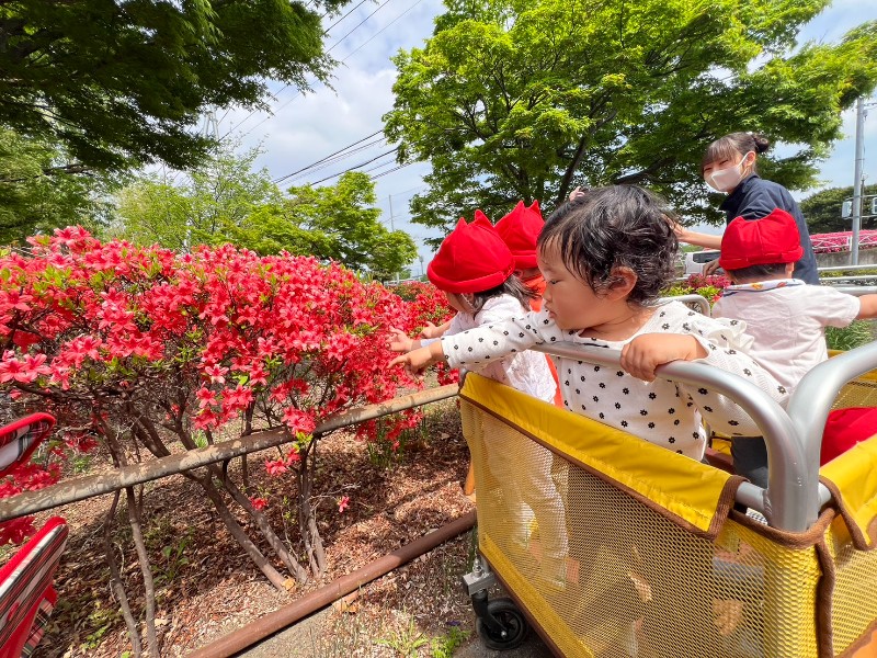 お散歩カートを見ると、にこにこ笑顔♪ご近所の方にも「ばいばーい!」と手を振ってごあいさつが出来ました!そして最後は綺麗なお花をこんなに近くで見ることが出来ました!