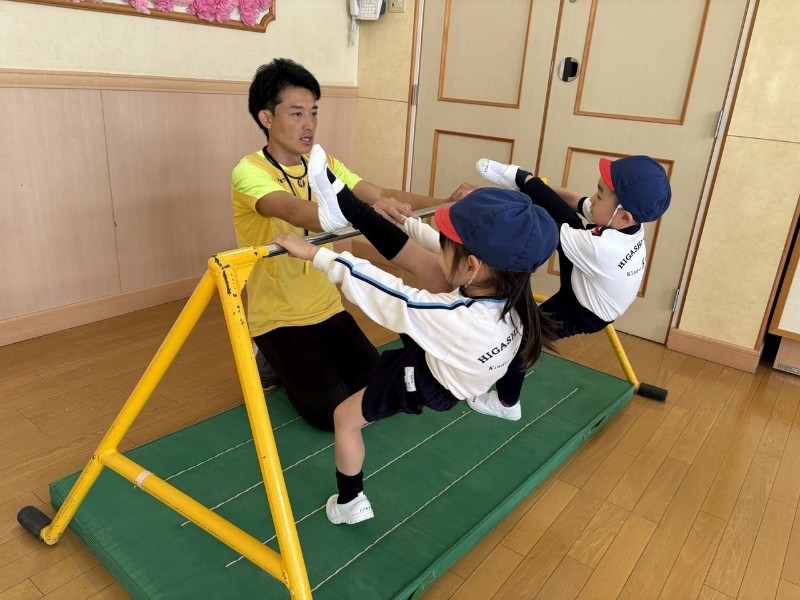 体操の先生とすぐに仲良しになっていました♪変身遊びではロケットなり「3、2、1、発射!」