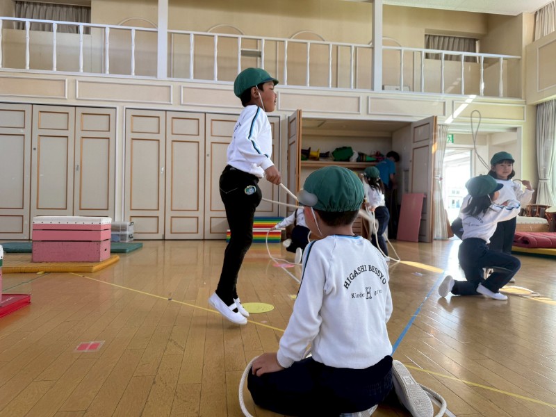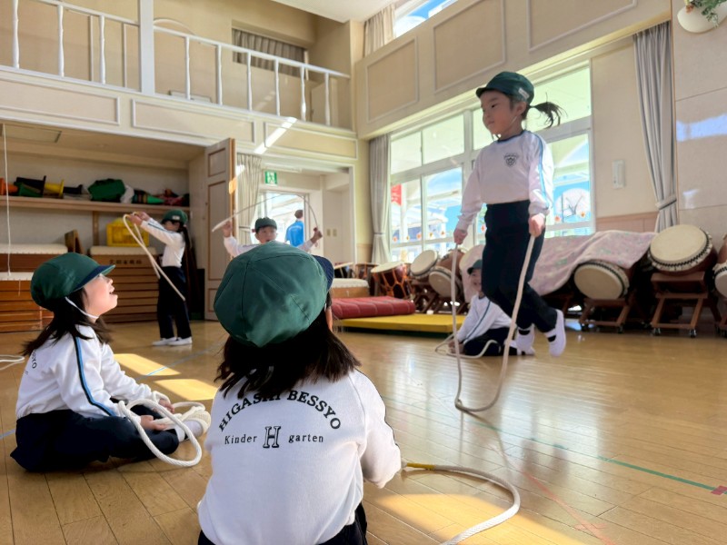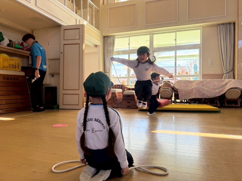 最近の体操教室では、ペアになってお友達の縄跳びの回数を数えています。