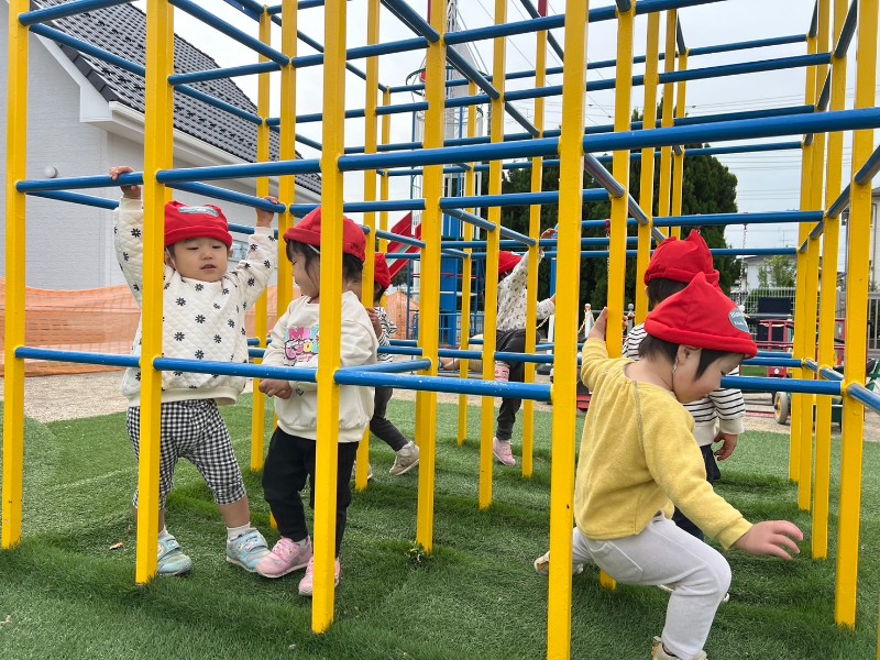アスレチックネットの上手に歩けるようになっています♪ジャングルジムでは何が始まっているのかな?