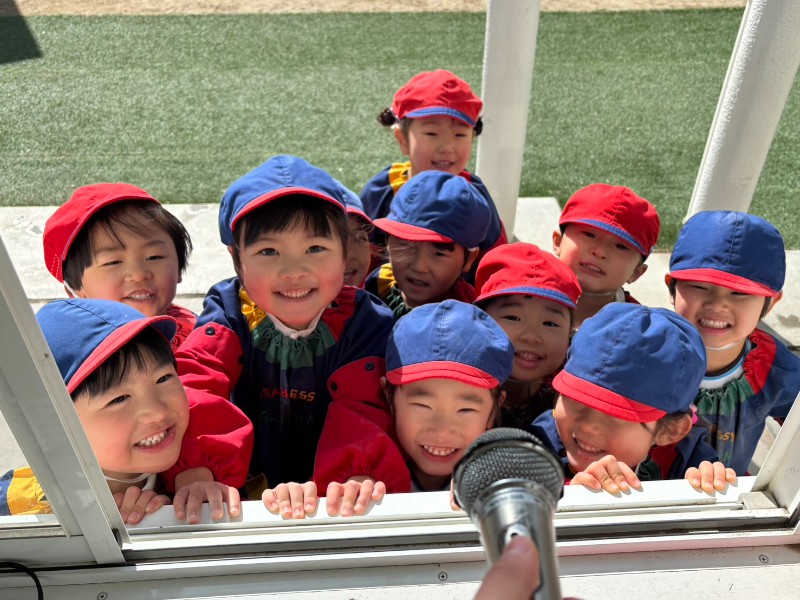 外遊び後の放送でお手伝いをしてくれる素敵なお友達を発見!!マイクに向かってみんなで・・・せーの!「お片付けお願いします!!」