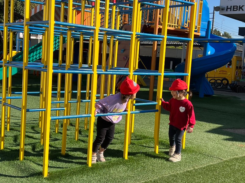 「こっちにきて!」「一緒に登ろう!」色々なお友達と遊び、たくさん会話が飛び交っていました!今週も元気に過ごそうね!《はるか》