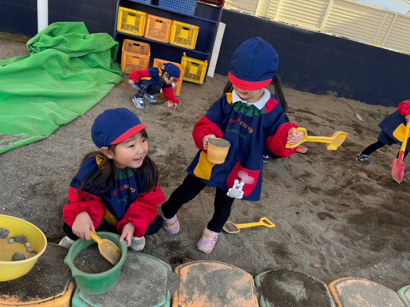 お皿に入れて、、トントントン!砂場コーナーではいつも美味しいご飯やおやつを作って先生にプレゼントしてくれるうさぎ組さん♪