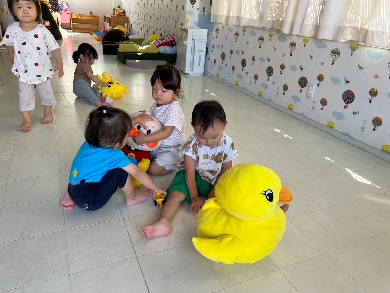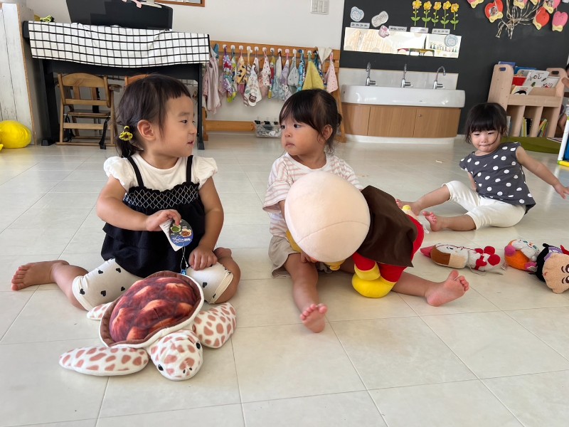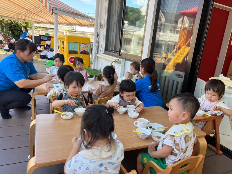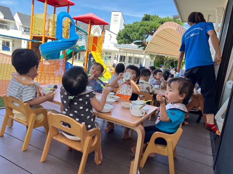 またキティ組に新しい仲間が増えました♪どんなお話をしているのかな❤これからも仲良く遊ぼうね♪気持ちがいい秋晴れ・・・そんな時はテラスでLunch!!いつも美味しい給食が、さらに美味しかったようです♥いっぱい食べて元気モリモリなキティ組でした!