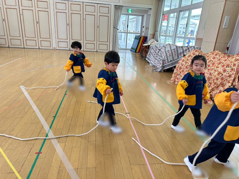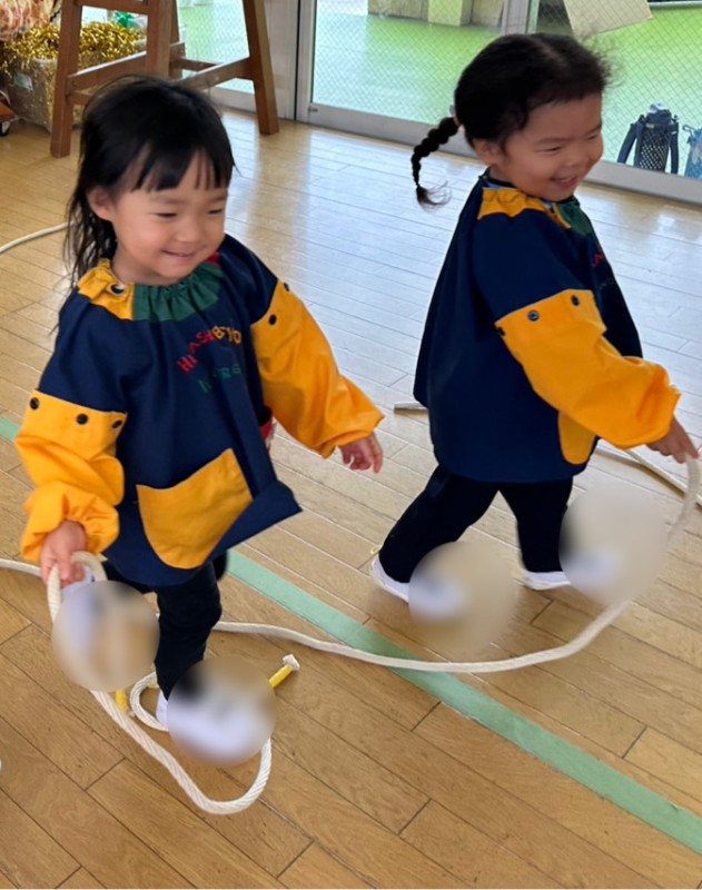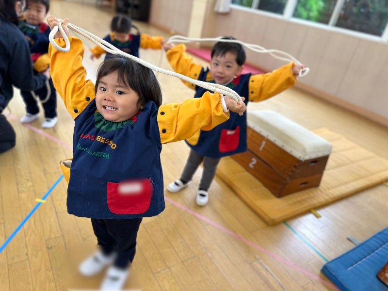 どうやって使うのかな?と戸惑う表情もみられましたが、としや先生の声掛けですぐに縄跳びとお友達になっていましたよ♥