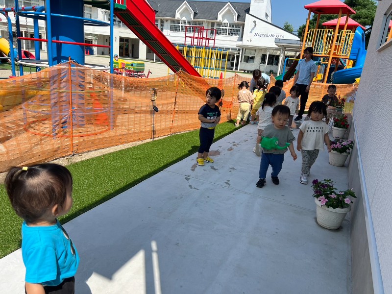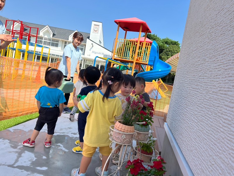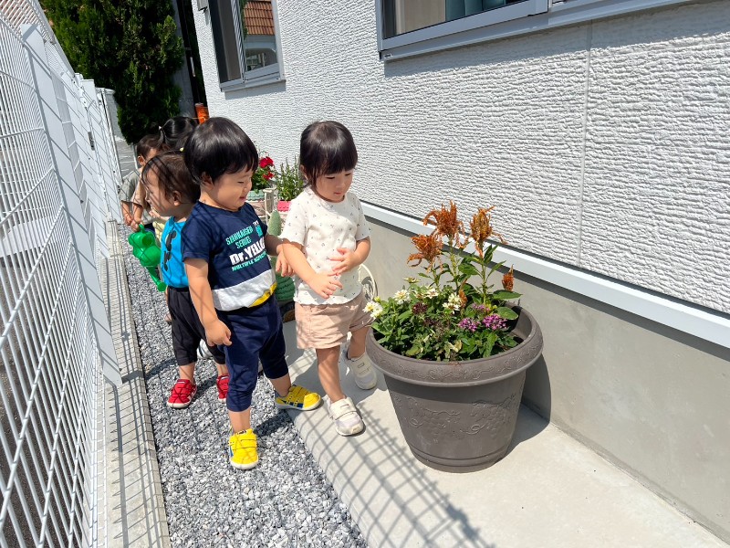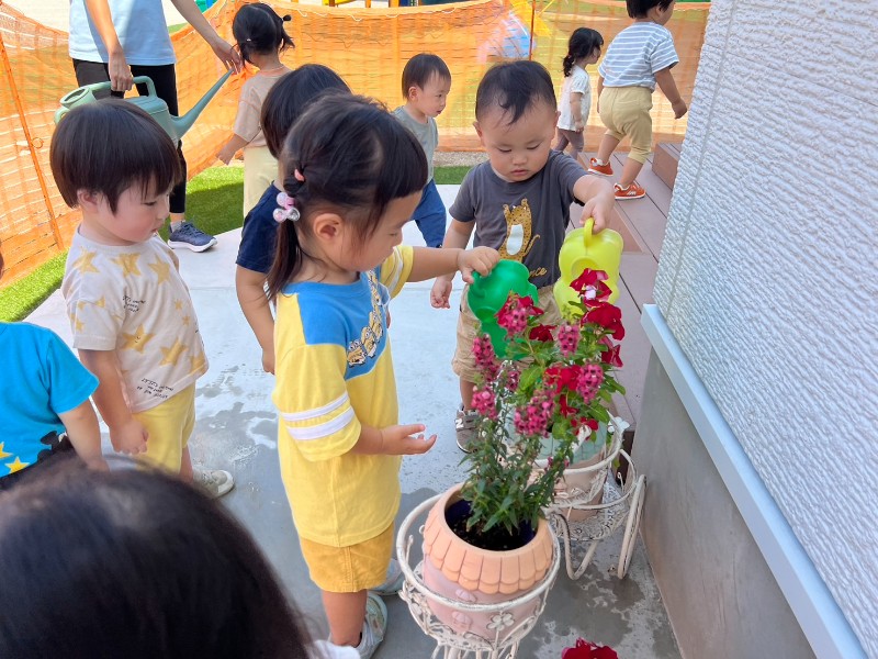 残暑がまだまだ厳しい中、お花もキレイに咲いていることに気が付いたキティ組さん♪「きれい~」「おみず、あげる!」ジョウロにお水をいれて順番に水やりをしました♪新しい部屋のアプローチもキレイにしていこうね❤