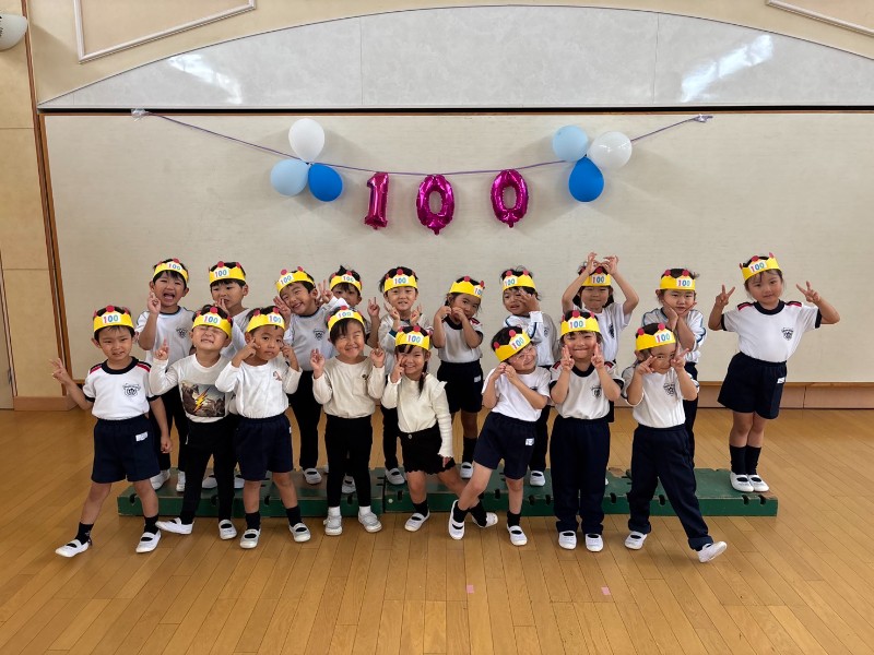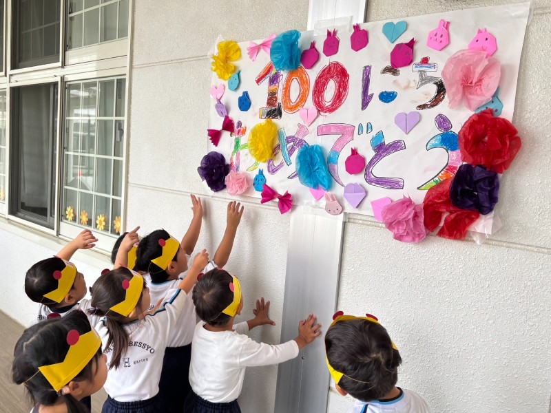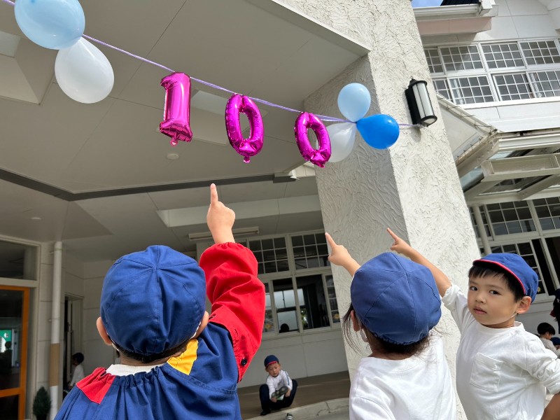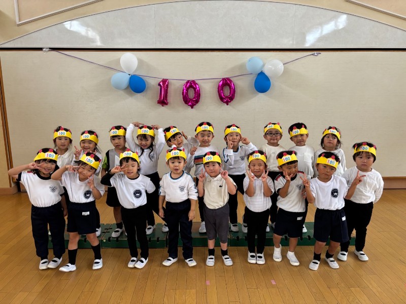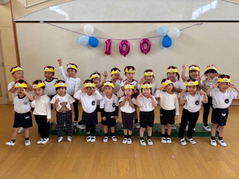 登園すると・・・門に飾られた100の数字!!入園して今日で100日が経ちました!先日の運動会も大成功に終わり体も心もグンッと大きくなったうさぎ組さん♪ぞう組さんからの大きなお祝いメッセージ嬉しかったね♡100日の記念ハットを被り各クラス記念撮影!楽しい・嬉しい・諦めない!!色々な気持ちを経験した100日間。みんなのその気持ちが100日間で沢山の挑戦と成長に繋がりました!PS.1年目の先生たちも100日を迎えました♪《里美》
