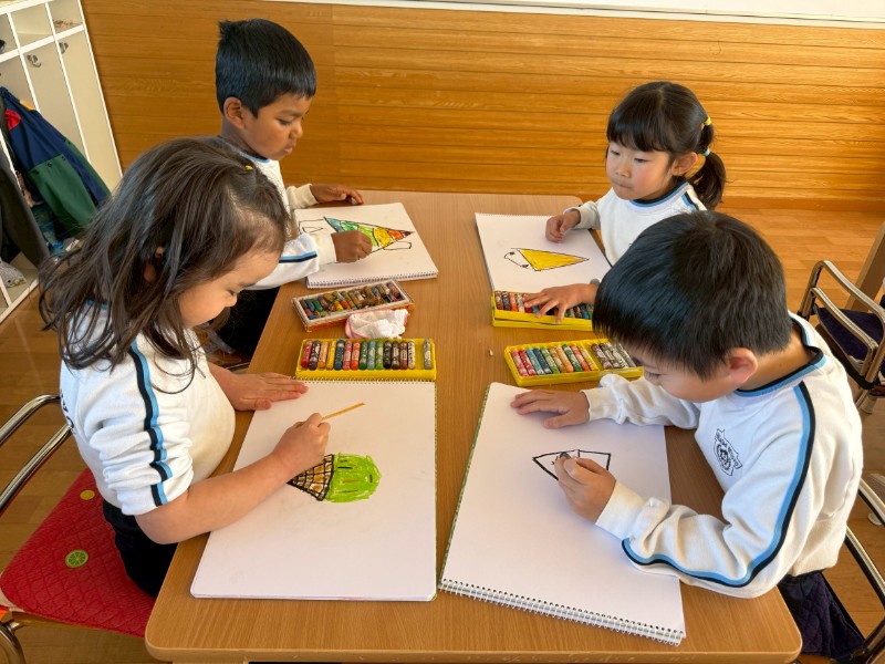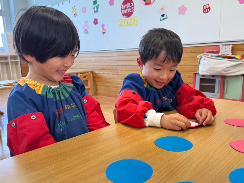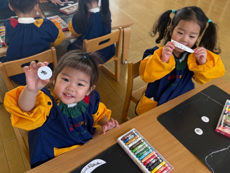 お正月と言ったら…コマ、凧揚げ、羽子板、獅子舞など…なかなか触れる事が少なくなってきましたが、これからも伝承を大切にしていきたいと思います。そこで、3学期初めの制作に獅子舞を作りました♪小さい画用紙に目や口を集中して描いていましたよ♪
