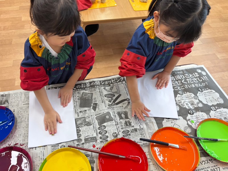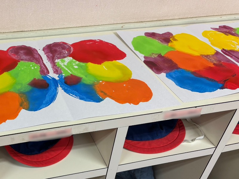 今日は「デカルコマニー」に挑戦!!画用紙の半分に絵の具をつけたら