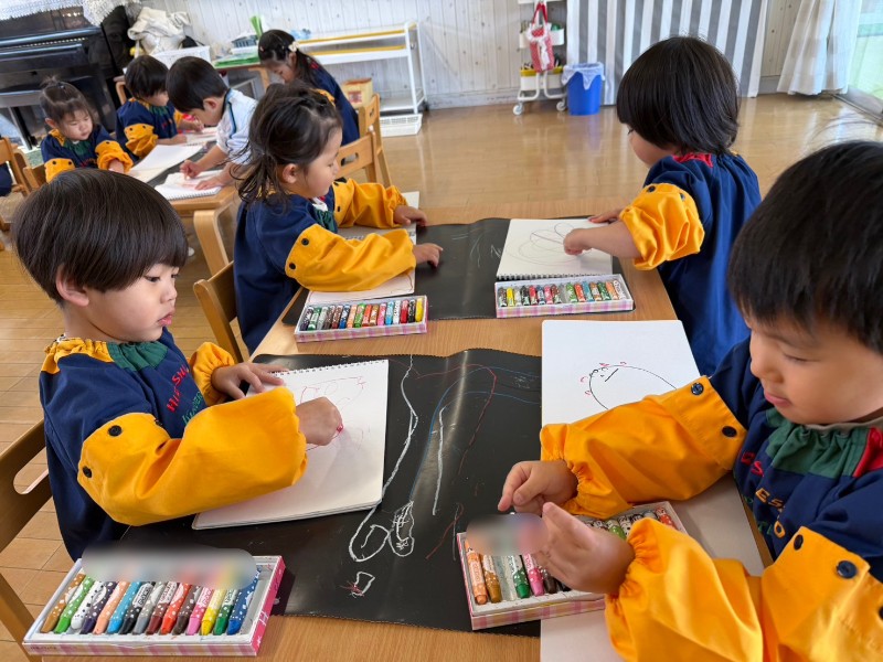 今日はみんなでお絵描き&粘土遊びをしました♬自分の好きな色のクレヨンを選び、〈果物・ママやパパ・動物・・・〉を上手に描くお友達がいましたよ❤
