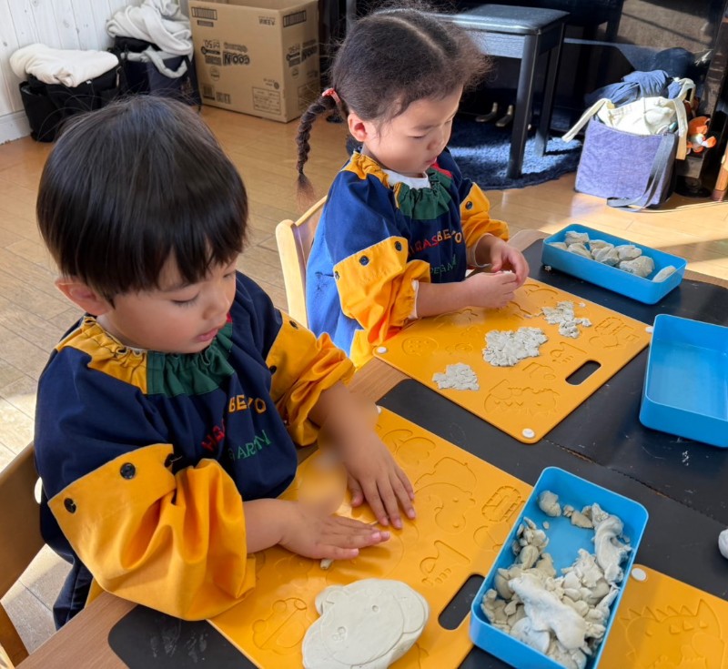 「美味しいフルーツが好き!」「お出掛けしたんだよ~!」と冬休みの思い出を振り返りながら取り組んでいました(*^^*)・冷たい粘土を触りながら、「氷みたいだよ!」「お餅みたい~!」と食べものを想像しながら取り組み、