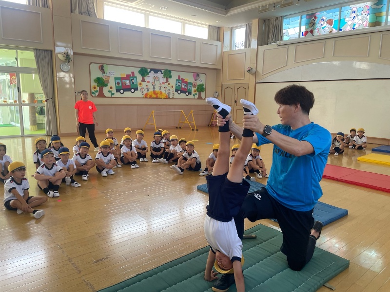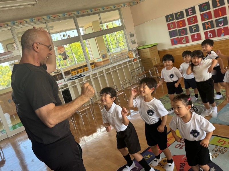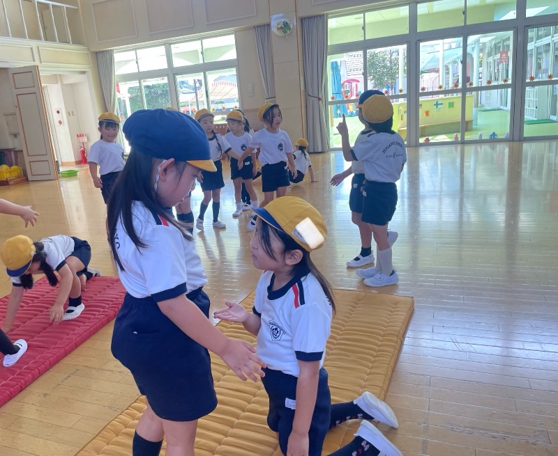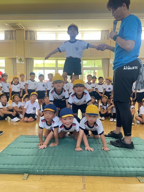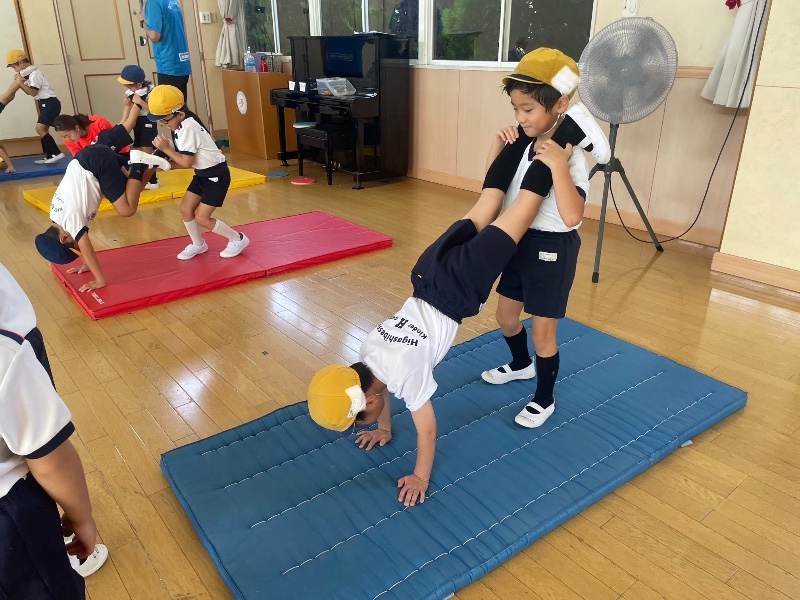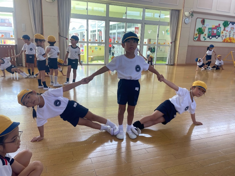 ジャンボ先生と組体操の技にチャレンジ♪手のつく場所や体の向きなど、細かな部分をみんなで考えながら行いました。グループの中で、自分はどんなポジションをするか話し合い、実際にやってみて、また話し合い・・・何度もチャレンジしていました。出来た時には、自然とハイタッチや拍手で称賛!!チーム力も出てきましたよ。