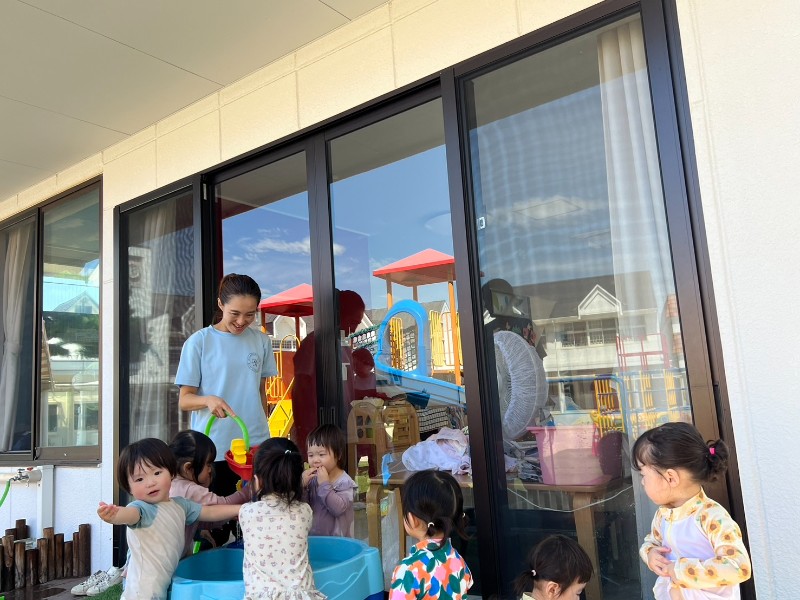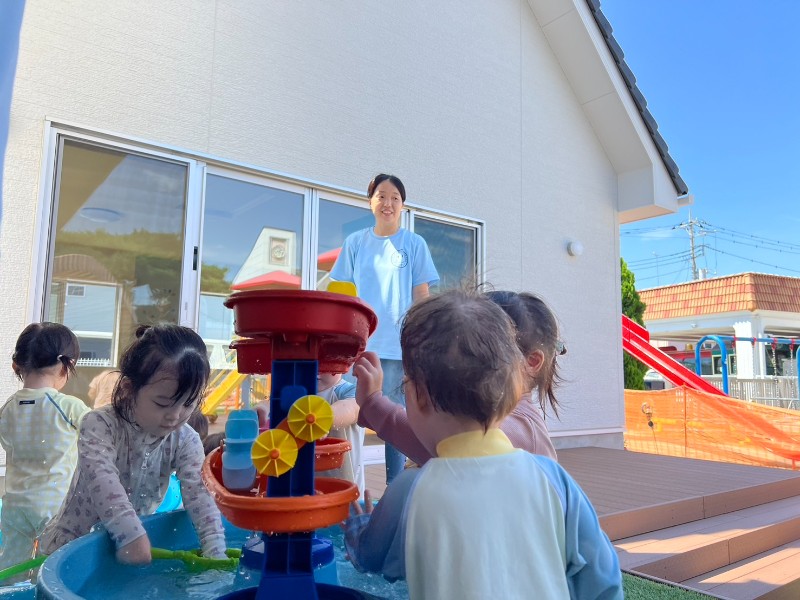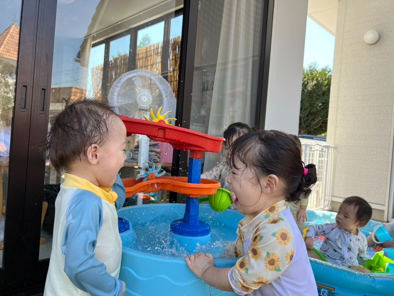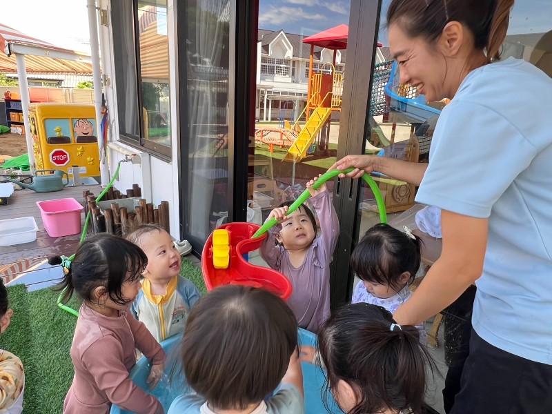 九月になっても暑い日が続いています♪水遊びができるのも残りわずか・・・水遊びを始めたころは水の冷たさにビックリしたり・・・濡れることがこわかったり・・・今では水遊びの楽しさを知り楽しい時間となっています❤