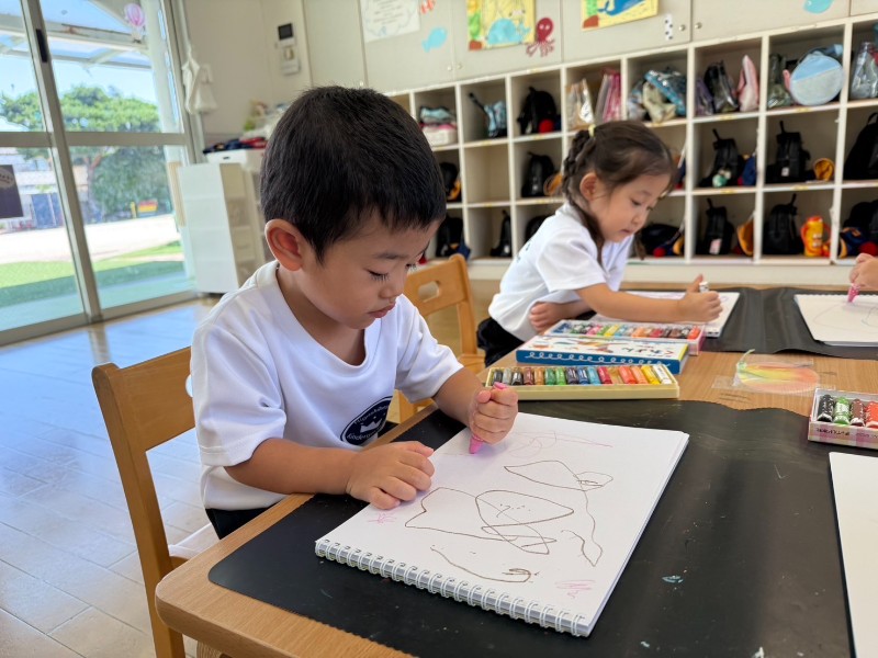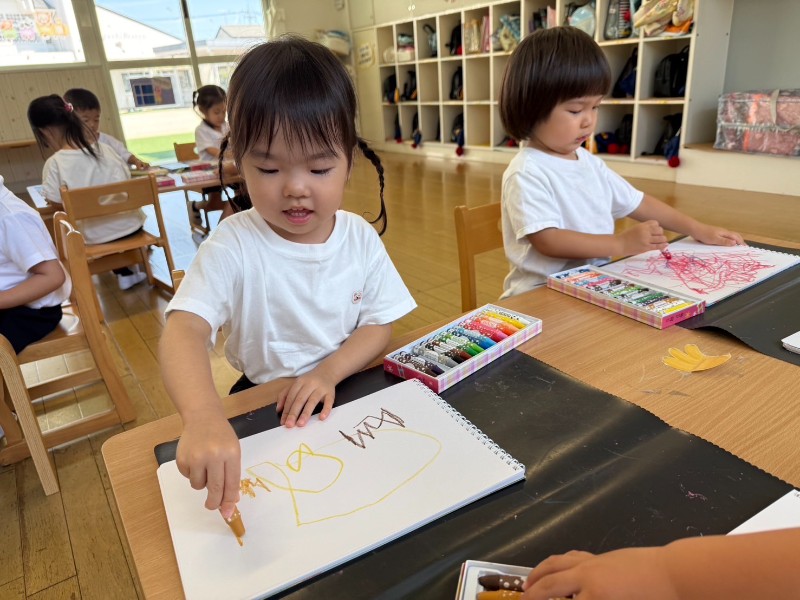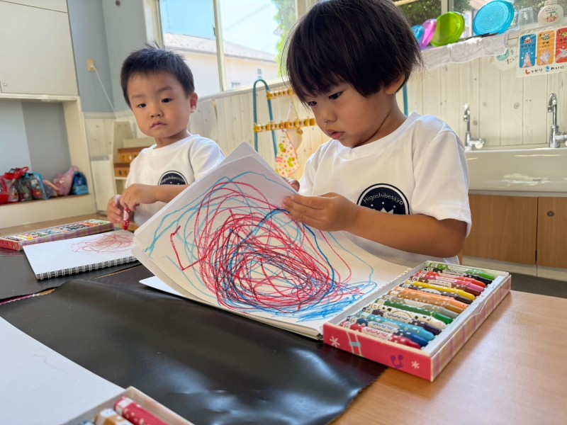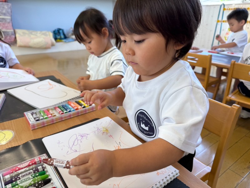 今日のパピー組はお絵描きday♬クレヨンの持ち方バッチリでしたよ!色々な形をたくさん描いて、その中を塗りつぶしたり、思い思いの絵を描いていました❤️どんな作品ができたかな??《ゆづき》