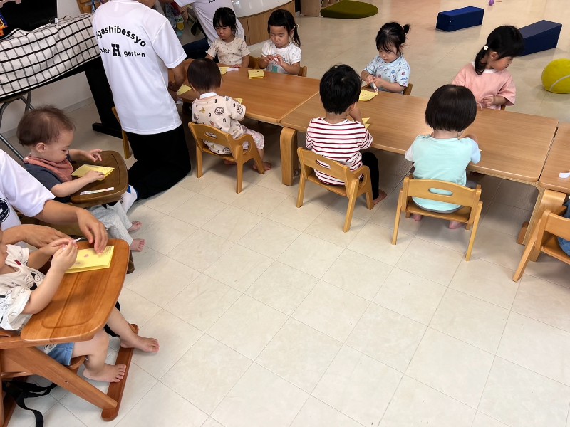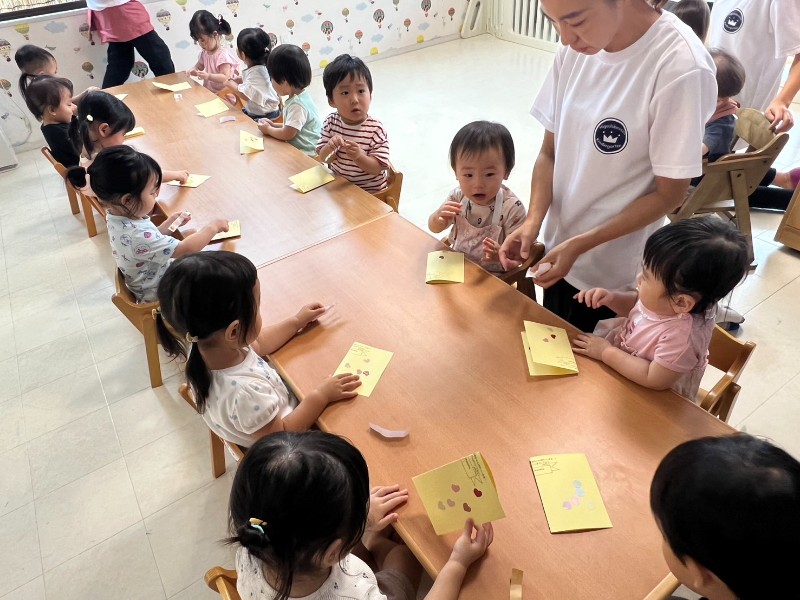 今日は折り紙製作を行いました♪自分の事だけでなく、困っているお友達にも積極的に声を掛ける姿が…!さすが、ぱんだ組さんですね❤三角や四角に折ったり…はさみを使ったり…