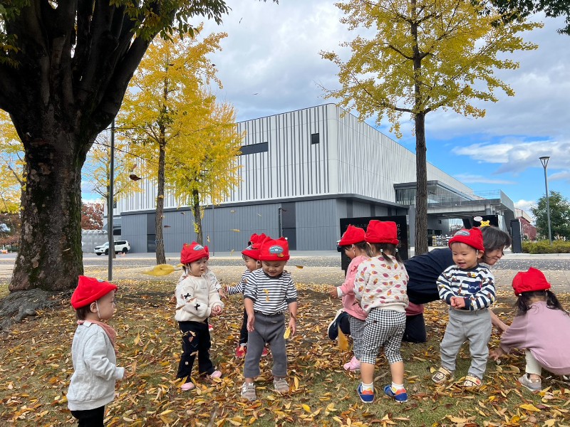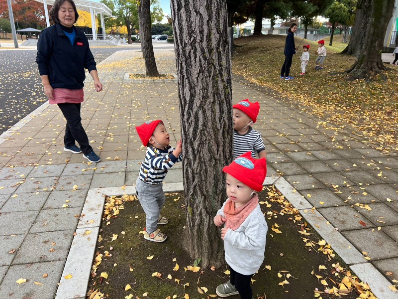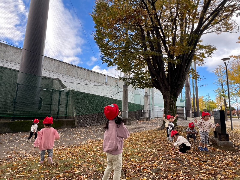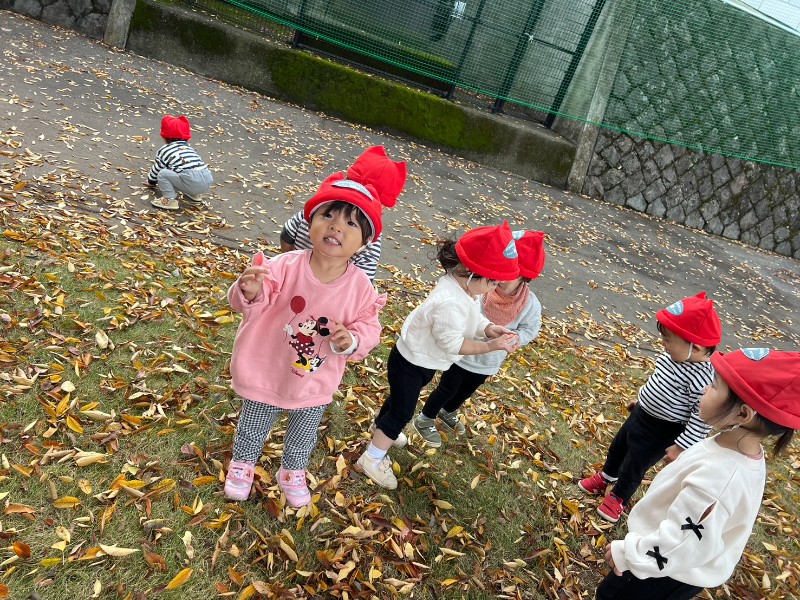 風が吹くと紅葉している葉っぱがヒラヒラ・・・不思議そうに見上げている子もいました♪