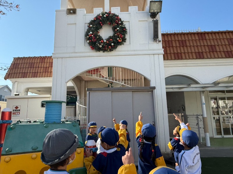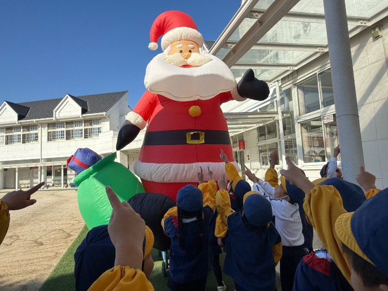 幼稚園がクリスマス仕様に変わってきました!いつも挨拶する門の先には大きなサンタクロースが・・「可愛いプレゼント持ってる!」「ひげがモフモフ~」などそんな呟きが聞こえてきましたよ♪