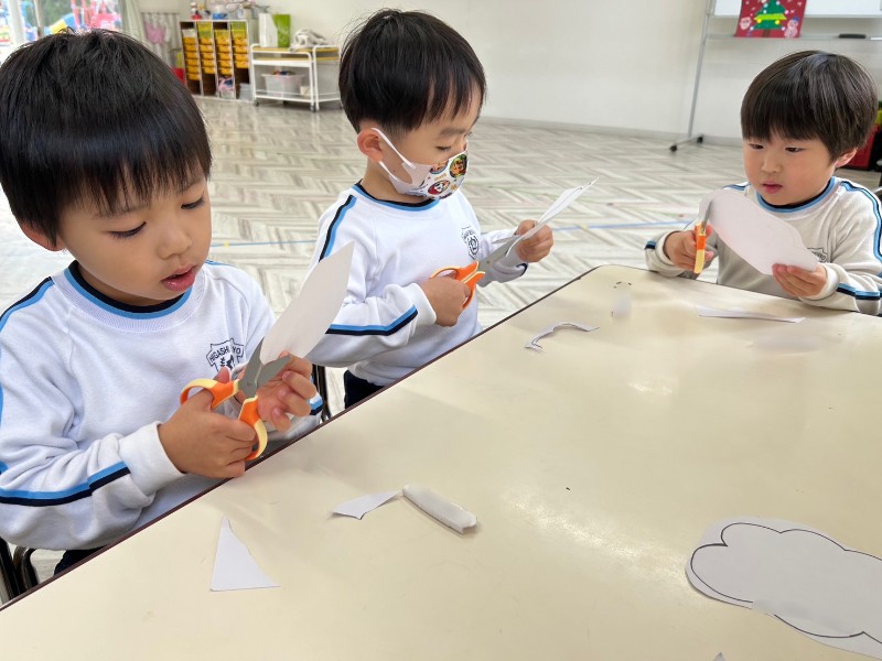 今日はハサミを使って製作をしました♪何やらもふもふの形をチョキチョキ・・・