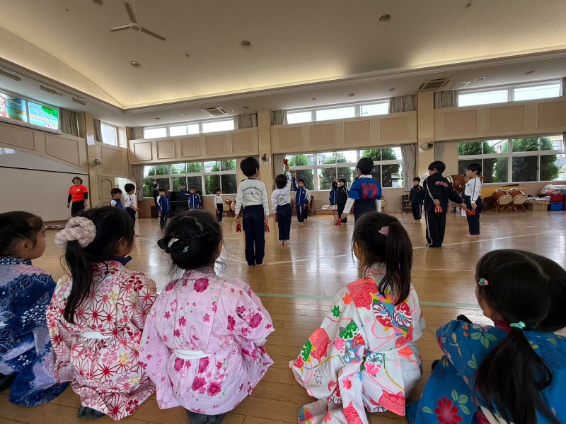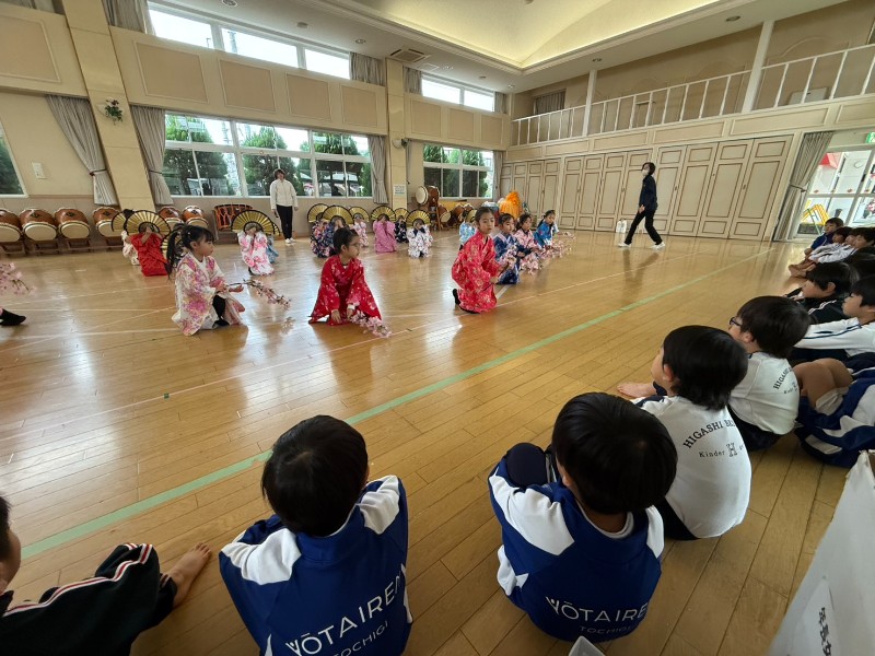 よさこい・さくらさくらの見せあいっこ!!浴衣を着て、鳴子を持ってお互い真剣に踊っている姿を見ながら「見られるの少し緊張した…」「みんなのタイミングが揃っていた!」と見て感じた感想を言い合っていましたよ♪