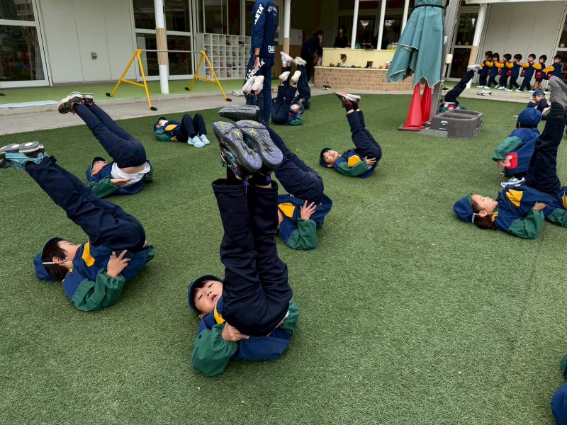 今日の体操はいつもとは違い、園庭で!!鉄棒、ブリッジ、首倒立のテストを行いました!