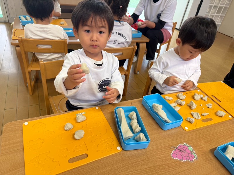 10月31日のあのイベントに向け制作をしました♬「大きなかぼちゃだね!」「怖いお化けは来ないかな?」と作りながらドキドキするお友達もいました・・・❤英語教室でボブ先生に教えてもらった単語もどんどん答えられるようになってきました★粘土遊びをしました♬「冷たいね~!」「何か匂いがするよ?」と五感を使いながら楽しむ姿が見られました!《すず》
