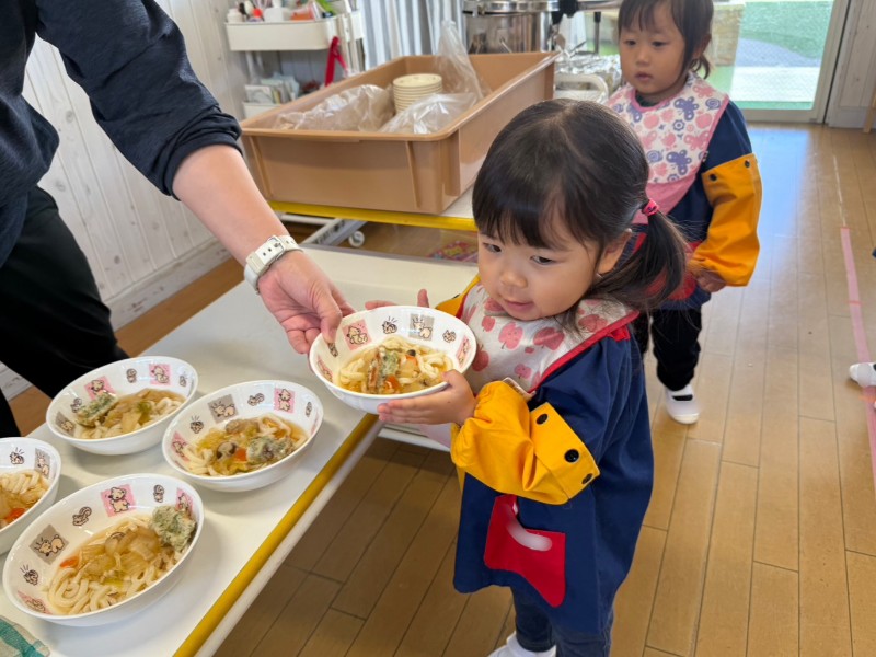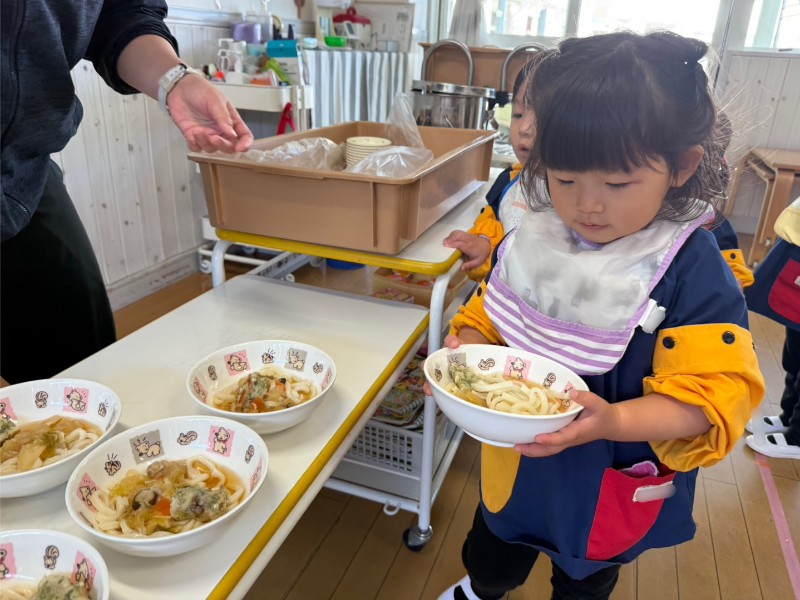大好きな給食の時間では一列にしっかりと並んで給食を自分で取りに来ています!「今日のご飯何かな」「美味しそうだね」とワクワクしながら、こぼさないように慎重に運んでいましたよ❤