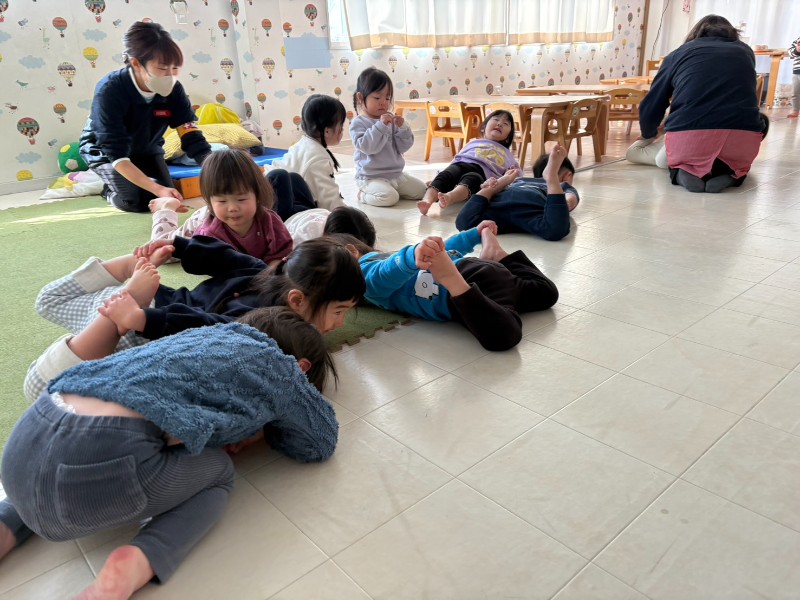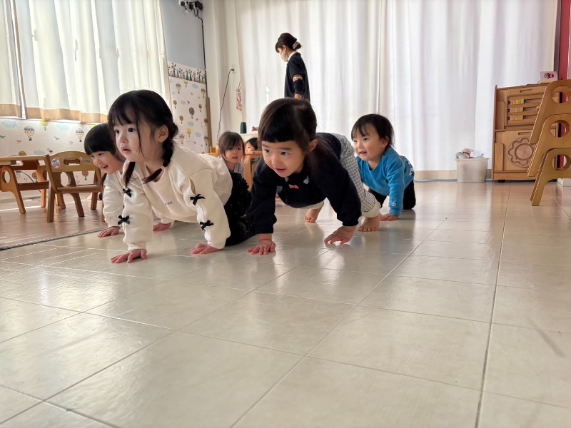 「ぴょんぴょん」ジャンプをしたり、ハイハイで教室中を歩き回り・・・どんな動物に変身したのかな♬最後は「カメさん」!!