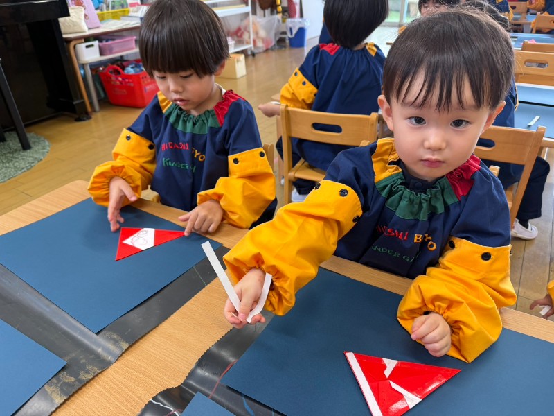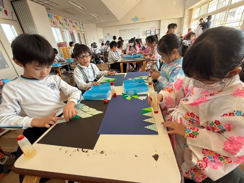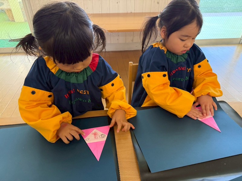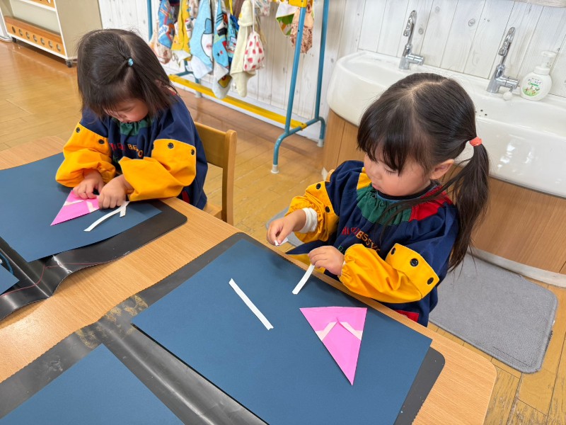 クリスマスの製作をしました!自分たちで折り紙の向きを考えながら・・・