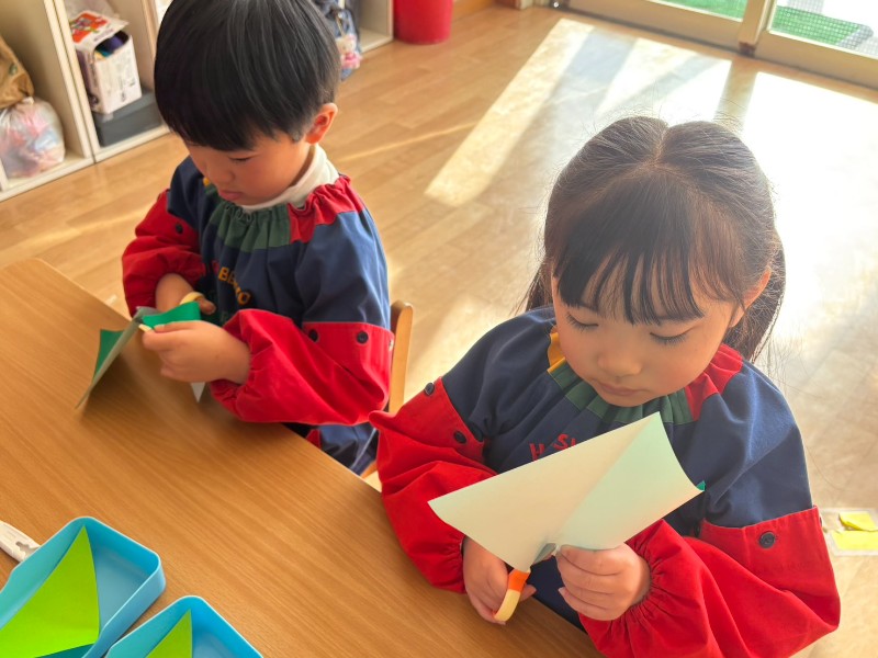 クリスマス制作第2弾!!はさみを使い、折り紙の折り目に合わせてチョキチョキ・・・