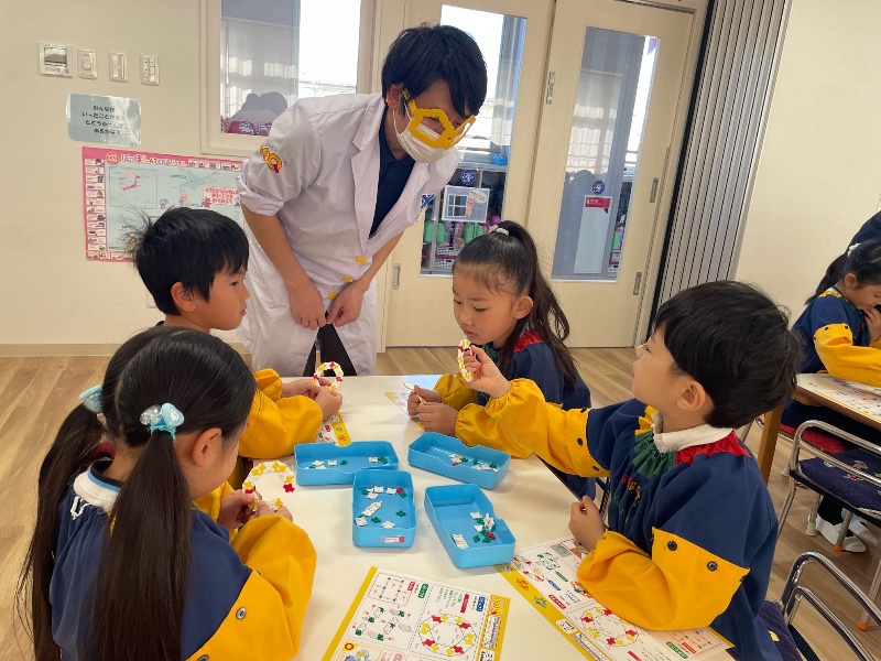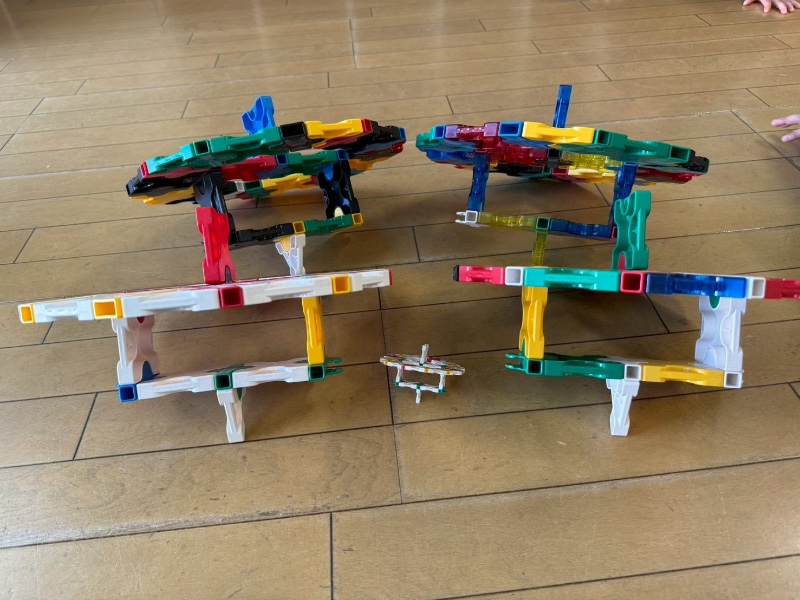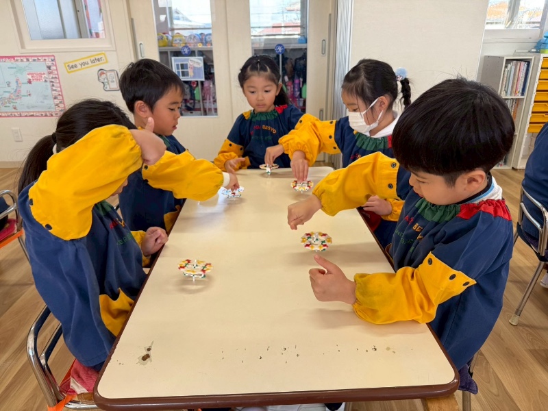 出来上がった子は、今度はお友達に教えあげたりする姿を見られ、LaQ博士からも、みんながこんなに早く完成するなんて凄い!と褒めて頂きました。最後には、全員でコマ大会!大盛り上がりでしたよ。作った作品は、持ち帰りましたので是非、お話してみてくださいね。P.s帰りには、LaQにチャレンジするお友達がいっぱい!!作り方もばっちり覚えた子ども達です。