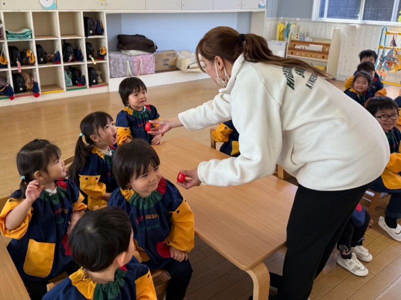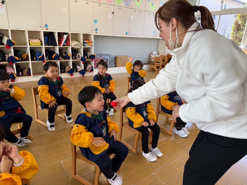 天気や果物の単語を教えてくれたり、歌を歌いながら手遊びをしたりと、とても楽しそうに関わる姿が見られましたよ♡そして・・・最後は『すごくお話をしっかりと聞いてくれて嬉しい!』と褒めてくれました♥今度はどんな単語を教えてもらおうかな~?(^^♪