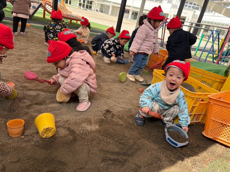 外遊び大好きなキティ組♬いつものように園庭に走り出し・・・あれれ・・・?砂場のシートがあいてることに気が付いた子がいました!「おすなばであそびたい!」その声を聞いて全員集合!!