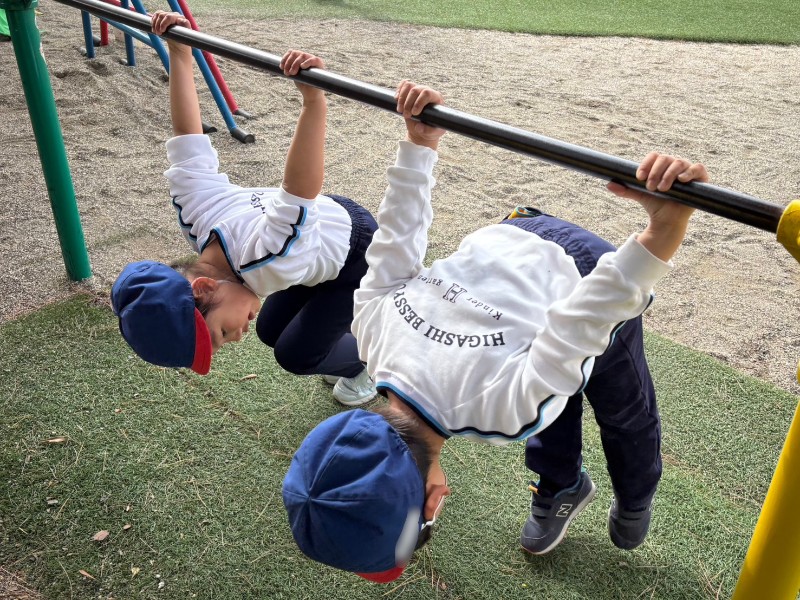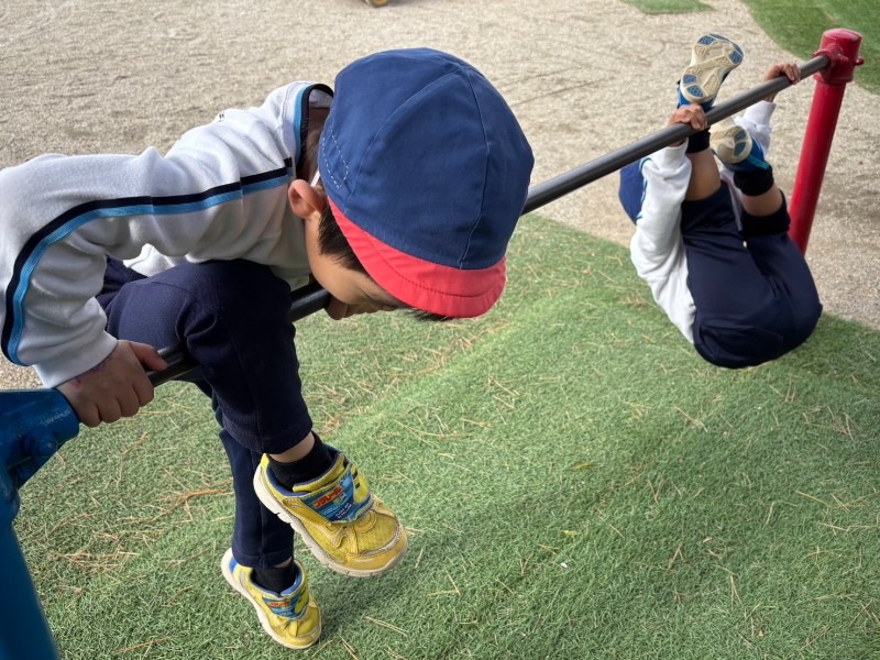 体操教室で取り組んでいる鉄棒を外遊びの時間を使ってチャレンジするお友達を発見!!