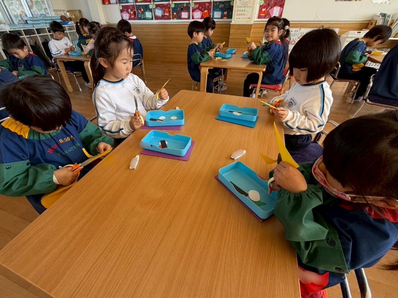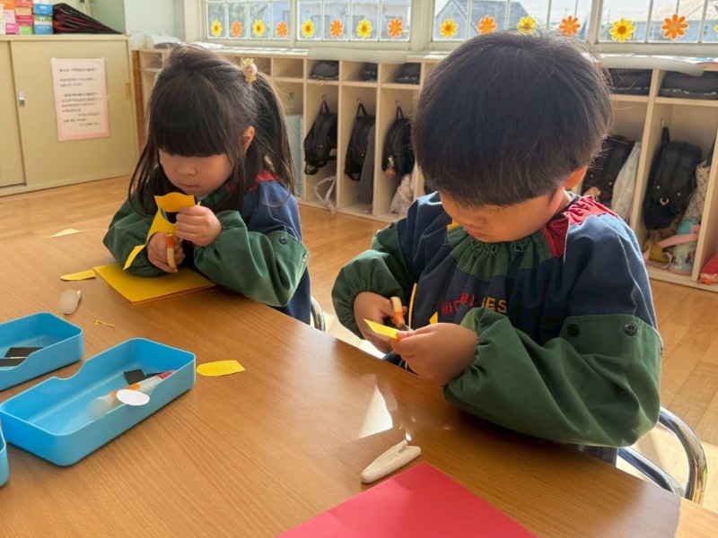 二月の節分に向けて製作がスタート!今日は鬼の角の部分をはさみを使って切りました!