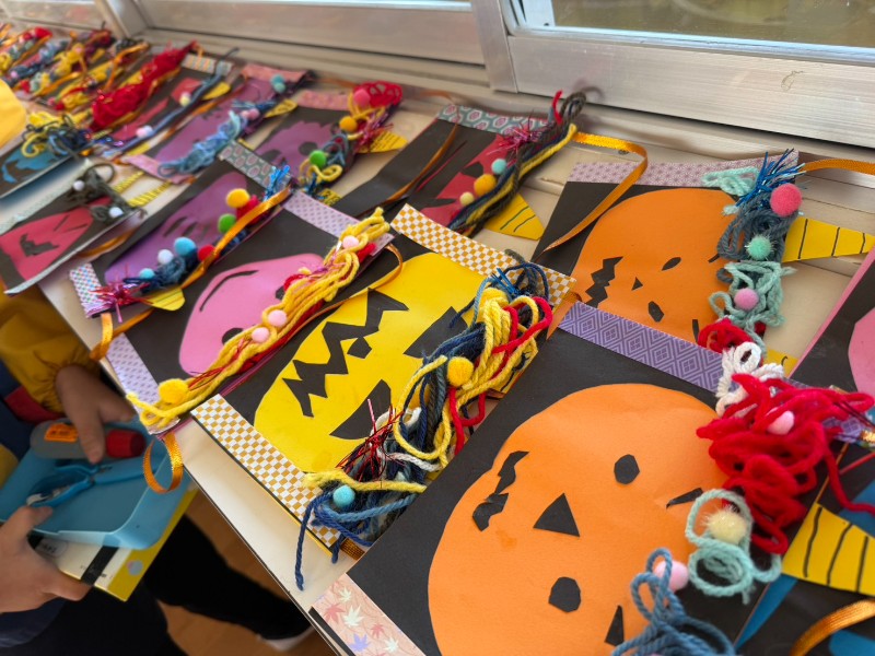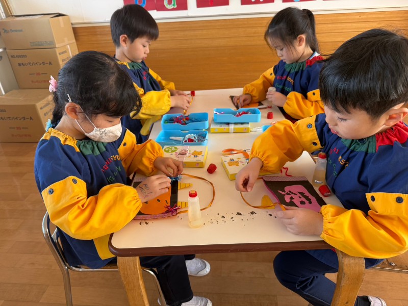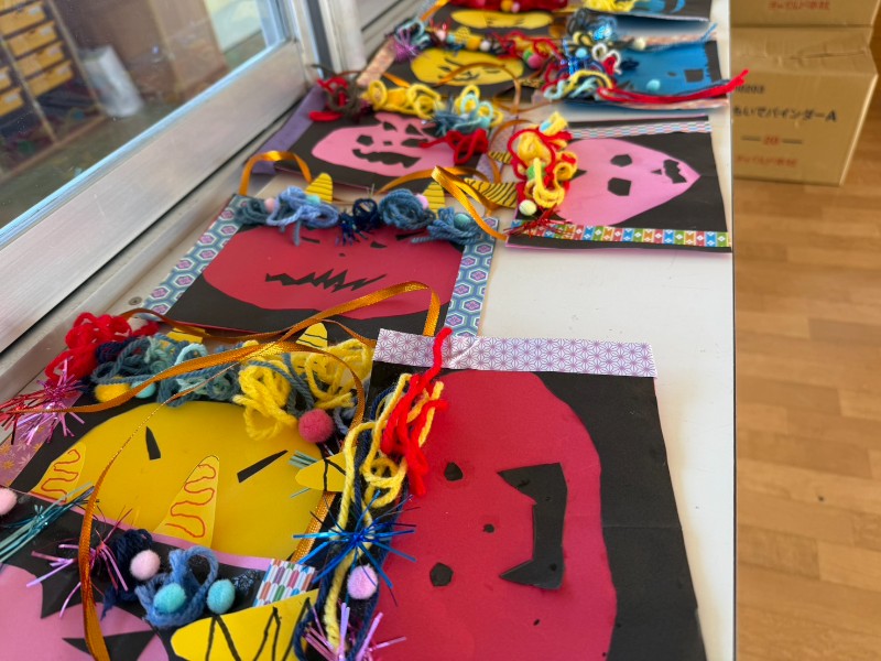 自分たちで輪郭を切って顔を貼るときには「怖い顔にしようかな?」「笑っているのもいいな~」と呟きも聞こえてきました鬼の髪を貼るときには子ども達の自由さが出ていましたよ!