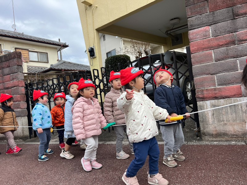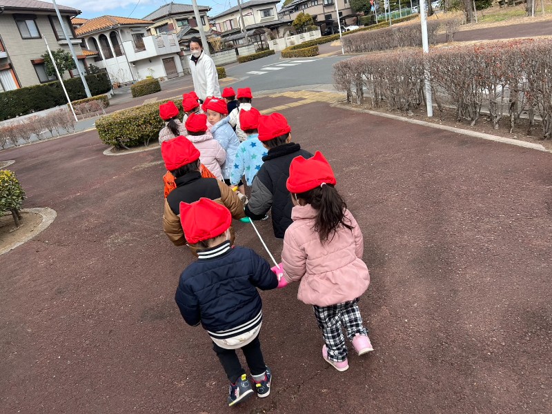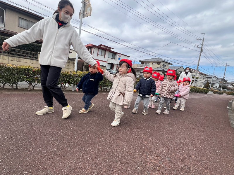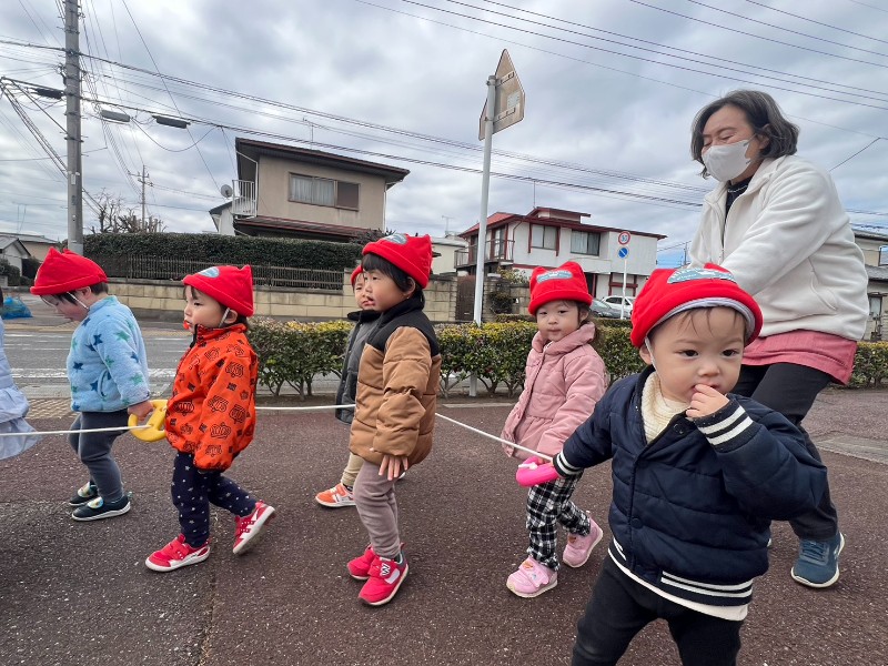 三寒四温のようにはいかず・・・寒さも暖かさも日替わりで体調管理も難しい日が続いていますがキティ組の子どもたちは今日も元気にお散歩に「いってきま~す」