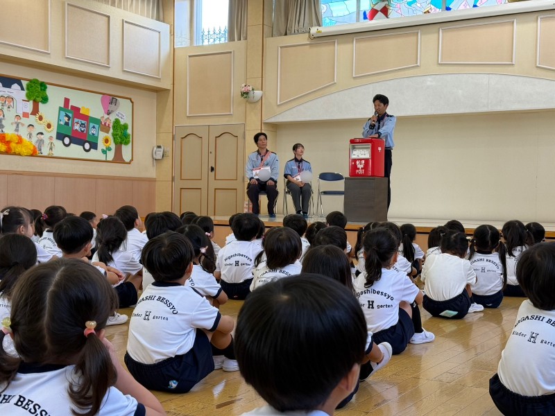キティ組から年長組まで郵便局員さんに見守られながら、「届きますように..」とお願いしてしっかりと手を合わせ投函が出来ました!!