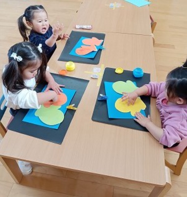 可愛くスタンプした手袋を更に可愛くしましたよ☺糊の感触を楽しみながら台紙に貼りつけました♡★パピー組★半分こ!