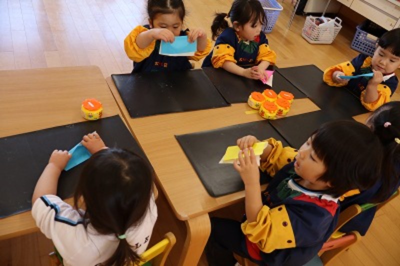 折り紙を半分に折って、アイロンすりすり~♬綺麗な半分ではないけれど、「出来た!!」この形が何に変身をするのかな?《荻原》