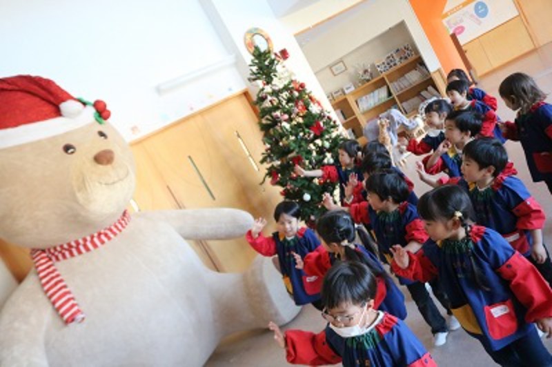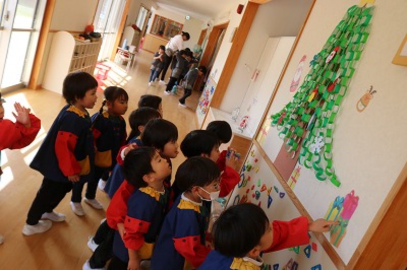 今日から12月!幼稚園の中もクリスマス仕様になってきました!廊下の壁面のクリスマスツリーや大きなくまのお友達のりぼんちゃん等子ども達も興味津々♬