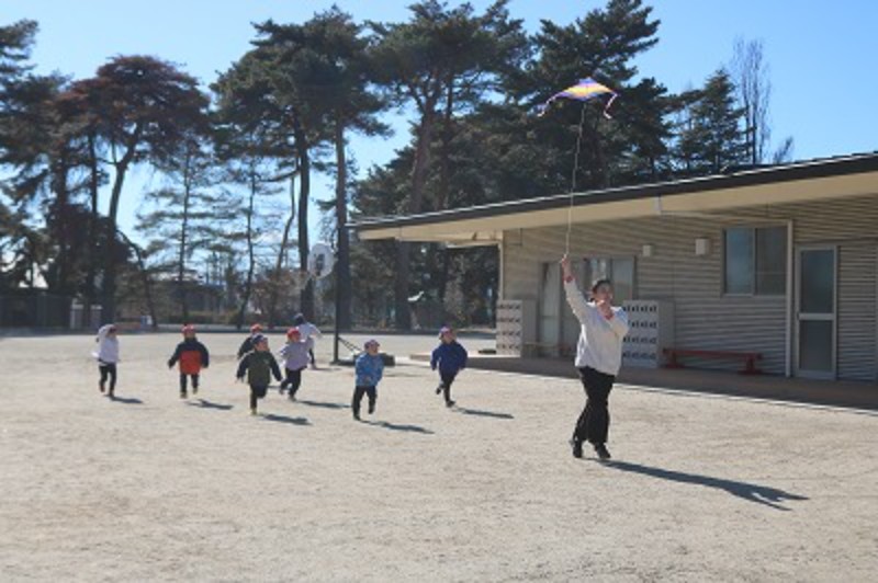 体操教室を頑張った後は園庭にLet's go!今日は凧揚げにチャレンジしました★凧を見ながら思いきり追いかけたり、実際に凧揚げをしてみたり♬